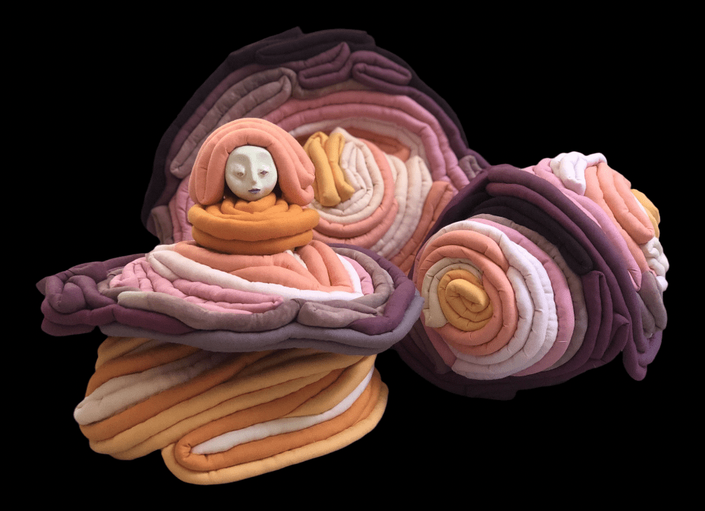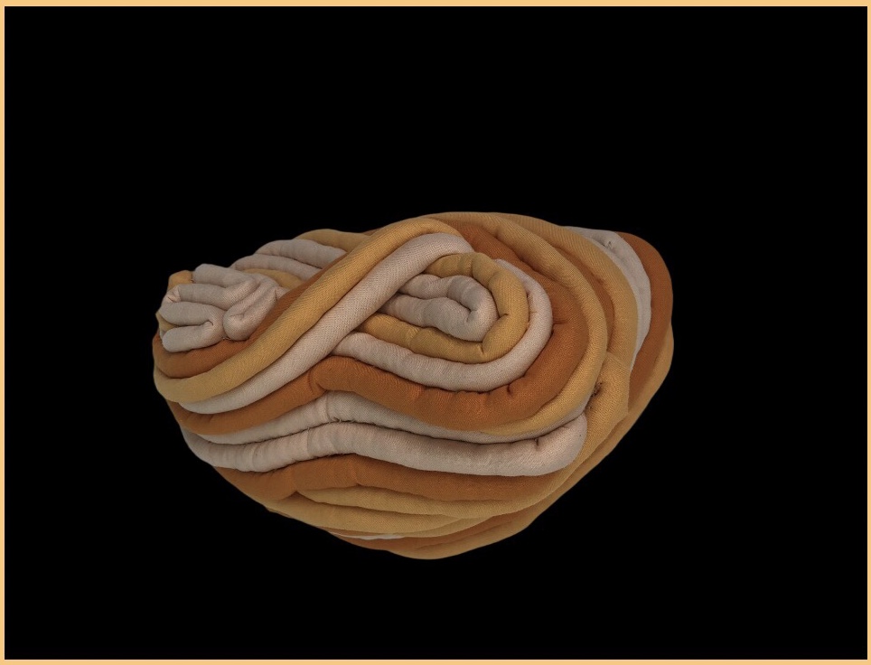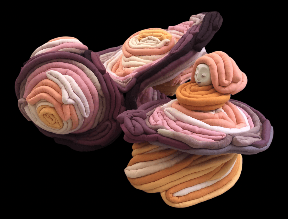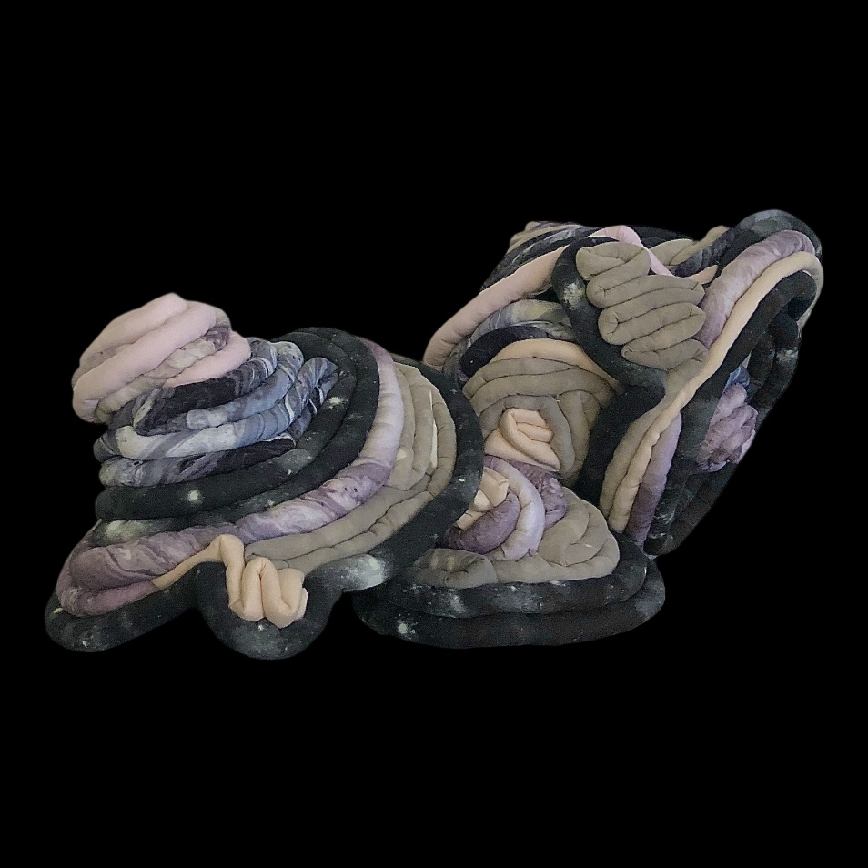 Moving to the pulsing beat of my brainwaves, these sculptures come together while I sit hypnotized behind a needle and thread. Taking on planetary patterns and the textures I imagine lay in between the fabric of our reality.